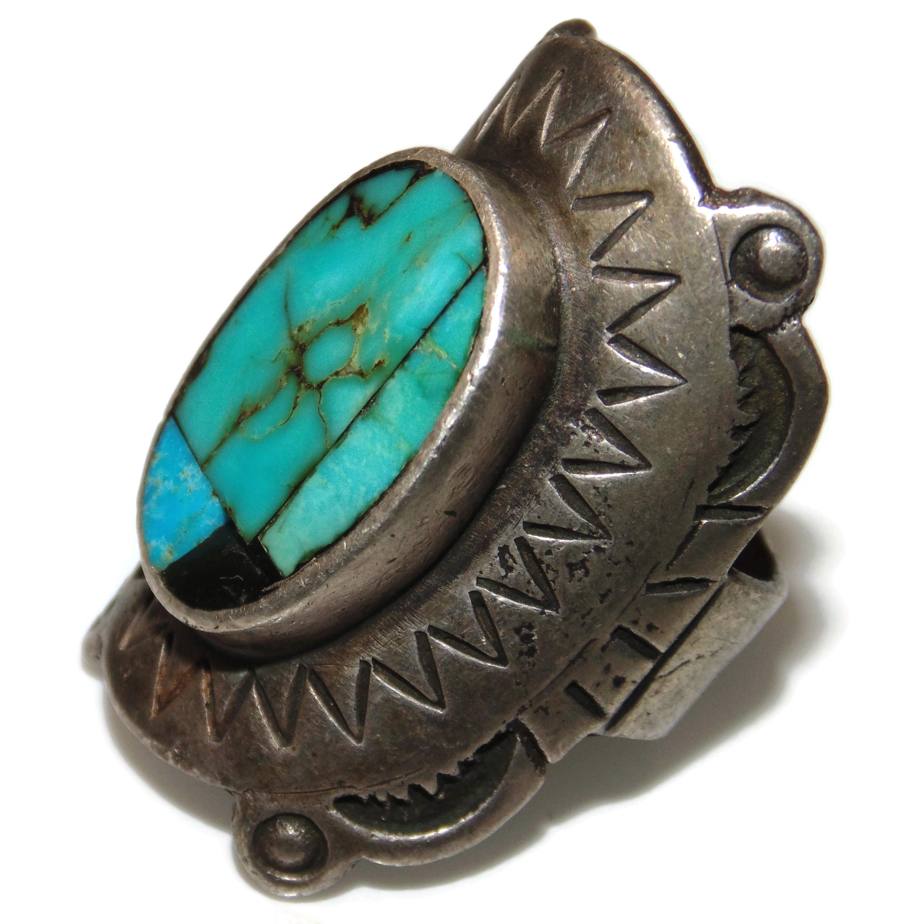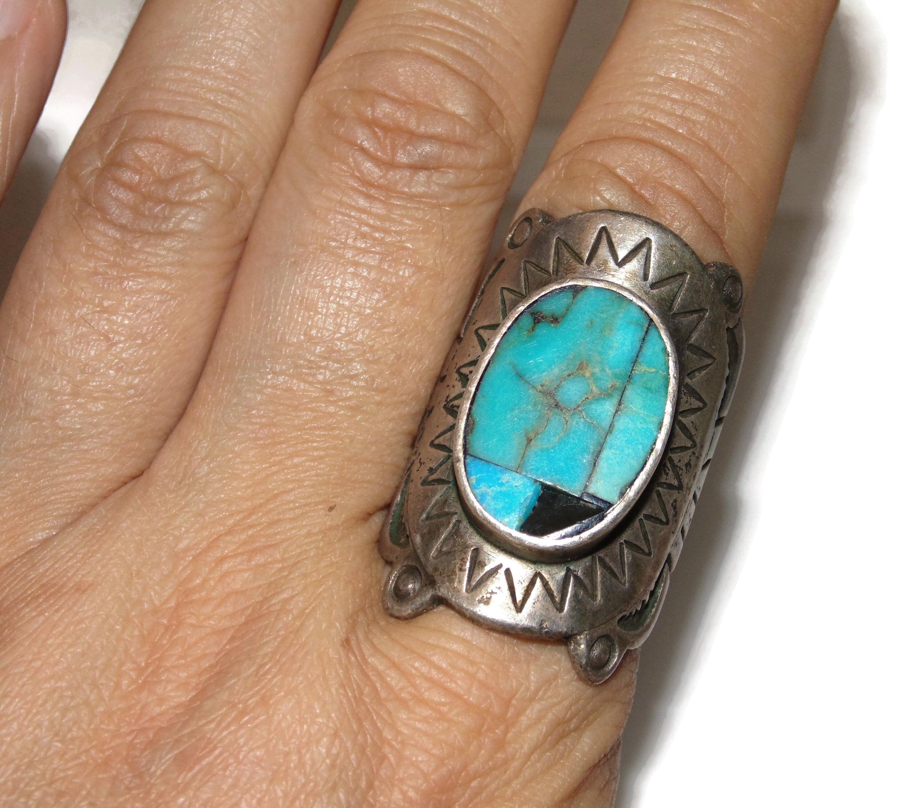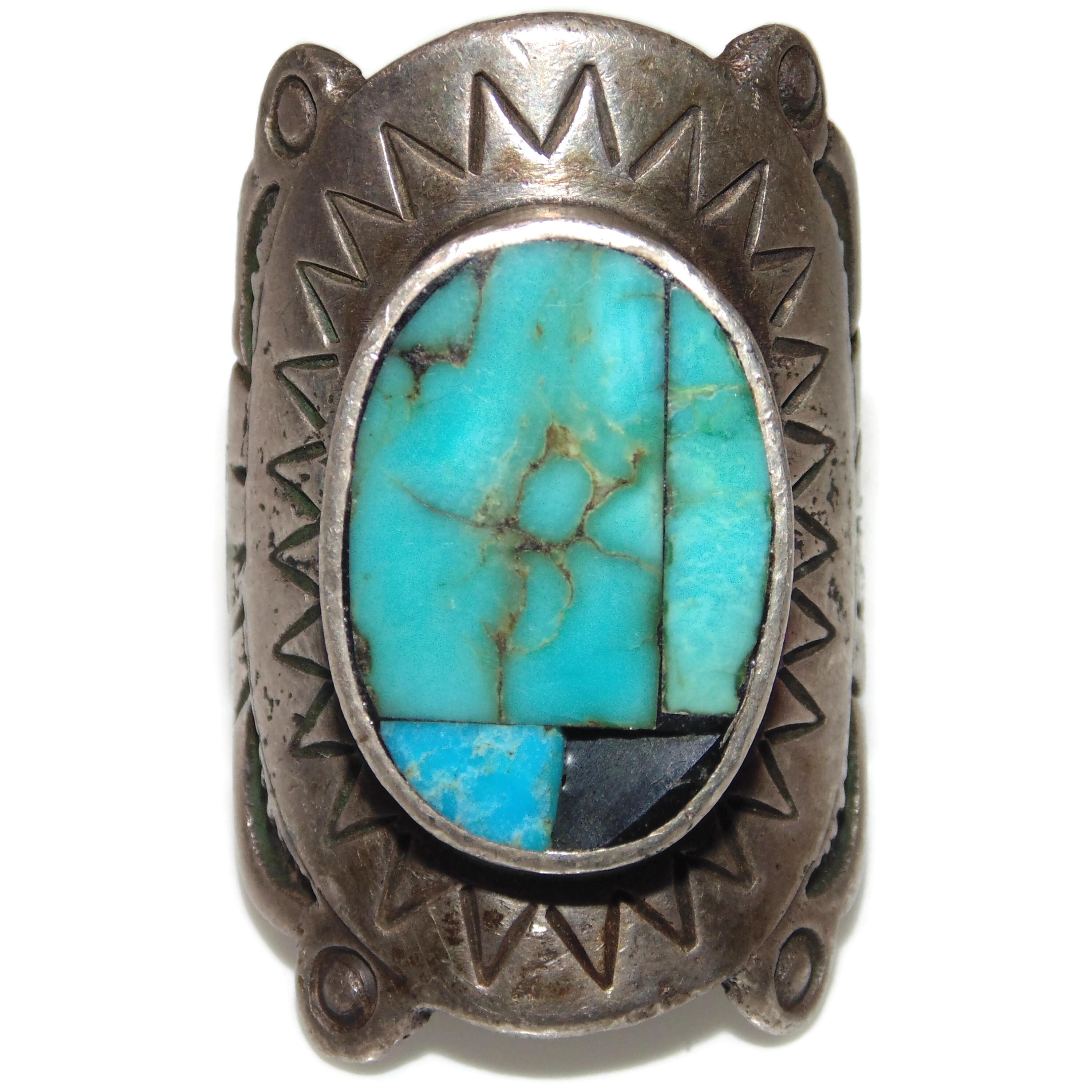 Stone: Natural Blue Turquoise, inlayed pieces, sone piece of onyx has been pushed on the inside and is on laying flat
